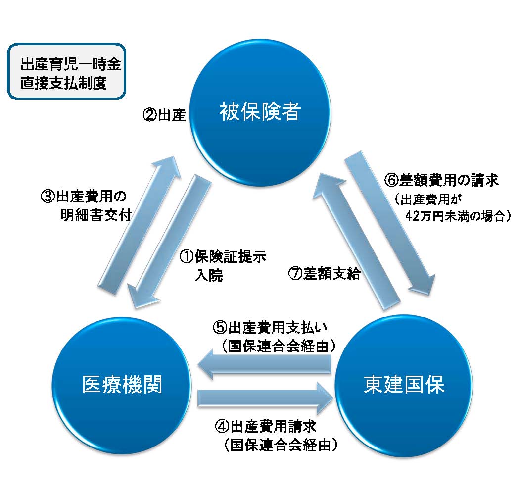 | 組合員が医療機関等を受取代理人として出産育児一時金を事前に申請し、医療機関が組合員に代わって出産育児一時金を受け取る制度です。 なお、この制度を利用するためには、医療機関の同意を得た上で、事前(出産予定日まで2ヶ月以内)に東建国保に申請する必要があります。厚労省の認めた医療機関のみ利用出来ます。 |